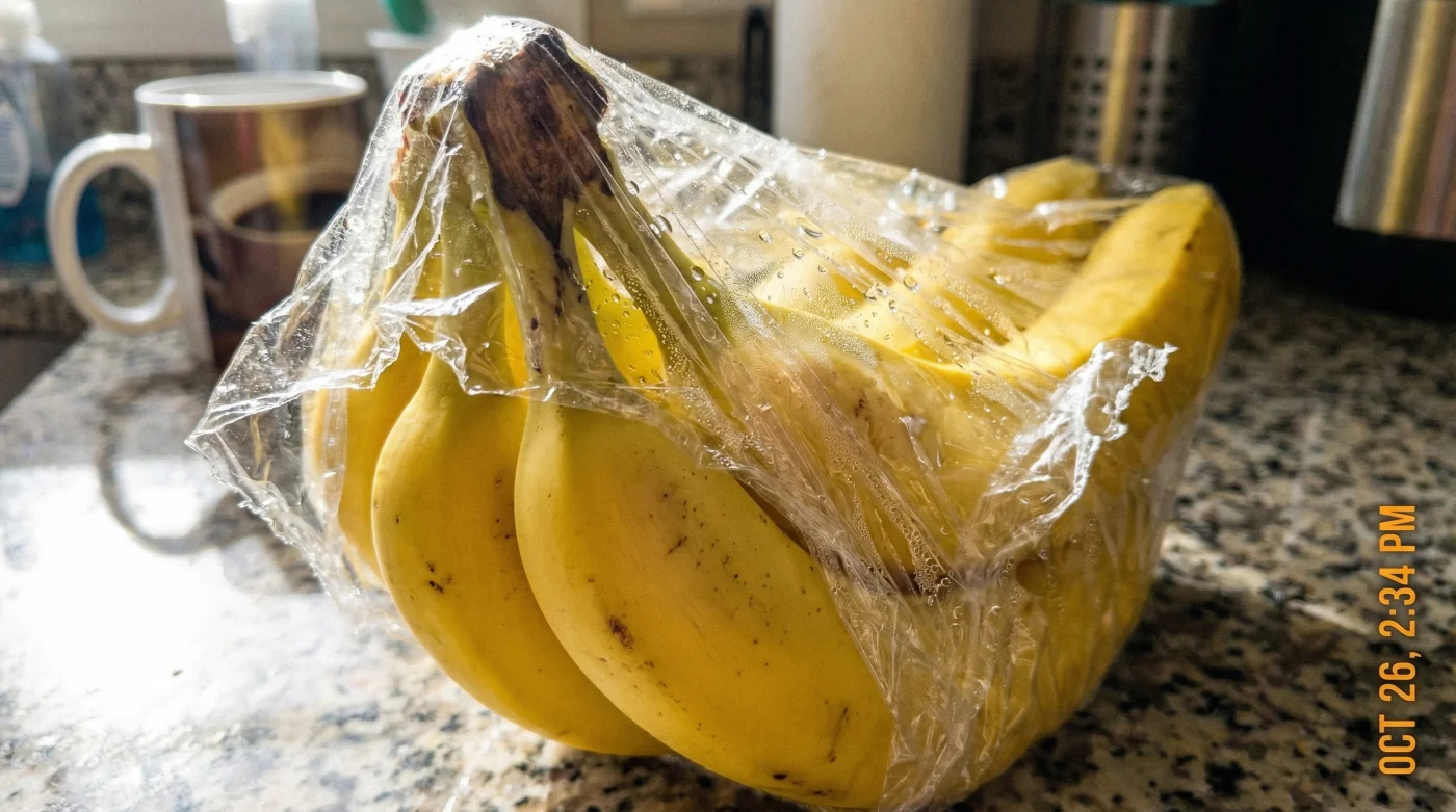 Muz hevenkinin tepe noktasina sikica strec film sarmak, bu gazin salinimini buyuk olcude hapseder. Gazin havaya karisip meyvenin govdesine inmesini engelleyerek, muzlarin sari ve taze kalma suresini tam uc haftaya kadar uzatabilirsiniz.