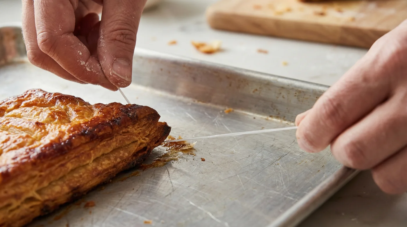 İpi her iki elinin işaret parmaklarına sıkıca dolamalı ve iki elin arasındaki boşluktaki ipi tamamen gergin tutmalısın. Gevşek bırakılmış bir ip, hamurun içinde bükülür ve düzgün bir kesi hattı oluşturamaz.